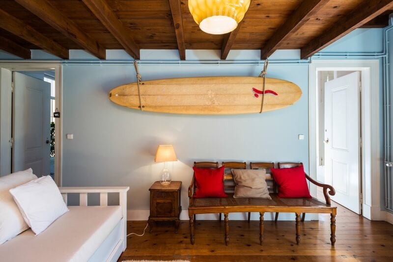 Este quarto branco no 1º andar da Lisbon Surf House tem 2 camas individuais. De maneira que podem ser separadas para fazer um Quarto Twin ou juntas para fazer um Quarto Duplo. A janela está virada para o jardim da frente da casa, dando um ar calmo a este quarto. Tem ainda uma vista parcial para o Oceano com o farol do Bugio no meio do mar.